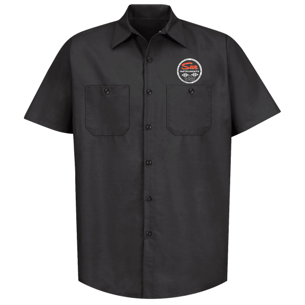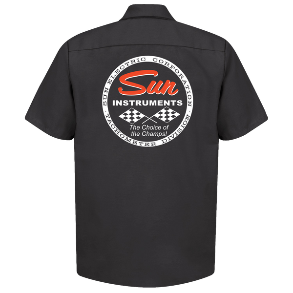 Sun Tachometer logo on the back, smaller logo on the left chest above pocket.